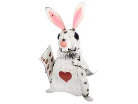 "White Rabbit" is a whimsical home and garden decorative piece inspired by its namesake Alice in Wonderland character. Crafted with care from recycled metal, this charming white rabbit comes adorned with a heart card, adding a touch of enchantment to any space.