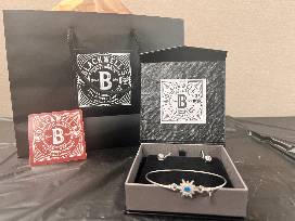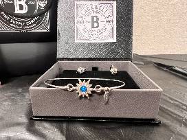 Silver charm bracelet with blue accent stone. Silver earrings from Blackwells in Ashland.