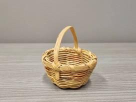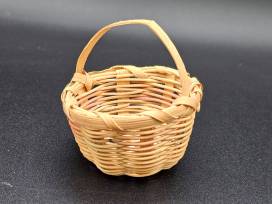 This charming handwoven basket is a delicate work of art, small enough to hold a single egg. The basket features an intricate weave with subtle dyed decorative accents that have gracefully faded over time, adding to its vintage character and charm. Its petite size and craftsmanship make it a wonderful addition for collectors of miniatures, folk art, or handwoven baskets.
