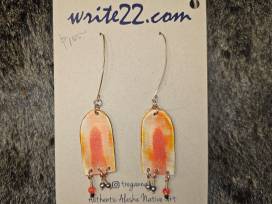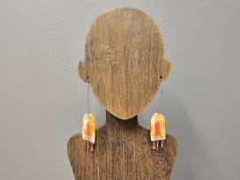 Introducing the 'Salmon Filets' earrings, long loop ear wires that showcase a striking combination of elements. The earrings are crafted with orange India ink-stained and polished moose antler, creating a vibrant, warm base. Complementing the rich tones are nectar-colored Keyocera opal beads, iridescent freshwater pearl beads, and sleek black onyx beads, each adding texture and contrast. This artistic piece of jewelry honors the salmon, an Alaskan treasure, symbolizing abundance, fertility, prosperity, and renewal.
