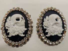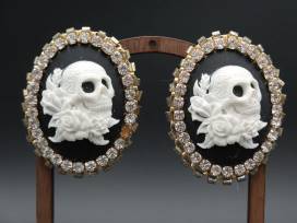 A stunning pair of gothic inspired cameo earrings by Inupiaq artist, Brittany Brower. These unique pieces feature intricately detailed white skull and rose designs set against a black background, framed with sparkling rhinestones and hand trimmed boarder of golden beads, for a dramatic and elegant effect. Perfect for lovers of edgy, vintage, or statement jewelry.