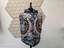 A wearable work of art! This handmade hooded vestpuk is designed with comfort and style in mind, making it perfect for layering in any season. Inspired by the timeless elegance of stained glass, it showcases bold geometric patterns, intricate floral details, and an iridescent zipper pull. A true statement piece that celebrates heritage and creativity.