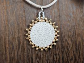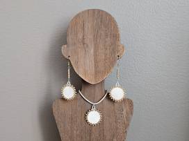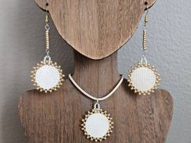 Elegant dangle earrings and a matching pendant necklace come together beautifully in this handcrafted set by Yup'ik Alaskan artist Kayla Rearden. The natural texture of white fishskin shimmers beneath delicate gold beadwork, creating a look that is both timeless and unique. As the light catches the gold against the fishskin, the entire set seems to glow.
