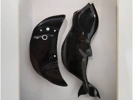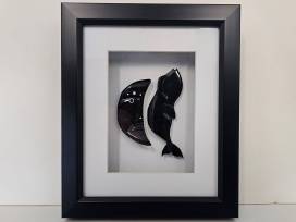 A gracefully curved baleen moon, its dark surface contrasting with the luminous inlaid ivory, sits alongside a bowhead whale-an essential figure in Inupiat culture-carved with exquisite detail to honor its vital role in Arctic life and sustenance. Framed in a shadowbox, Jon Ipalook's artwork beautifully captures the eternal connection between the rhythm of the ocean and the pull of the moon.