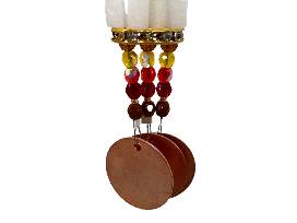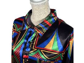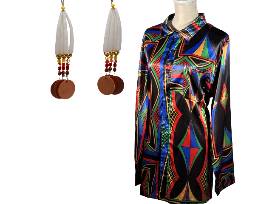 This elegant ensemble features a Satin Parfleche Button Up Blouse by Lauren Good Day, a celebrated Arikara, Hidatsa, Blackfeet, and Cree designer. In size 2XL, the blouse merges traditional motifs with contemporary fashion, honoring Indigenous artistry through its parfleche-inspired design. Lauren's work reflects a deep connection to identity, storytelling, and visual legacy, making this piece a meaningful addition to any wardrobe. Complementing the blouse are earrings handmade by DinÃÆ'Ã'© artist Lavern Tsosie. These earrings showcase shimmering crystal beads combined with natural dentalium shells and warm copper accents. Lightweight and striking, they blend traditional materials with modern elegance, perfect for collectors who appreciate artistry and cultural heritage.