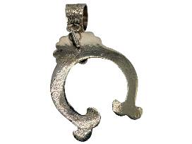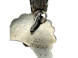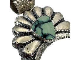 This large sandcast Yei Bi Cheii Naja pendant handcrafted by Navajo artisan, Gary Custer, featuring a striking Carico Lake turquoise stone at the center. The Naja, symbolic of the Talking God and unity, measures 3 inches in diameter and is accented with a substantial textured bale, showcasing both strength and elegance.