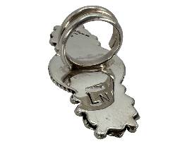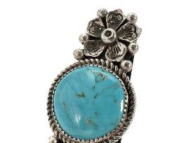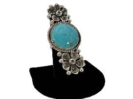 Timeless and classic, this Naabaahii made adjustable ring features a striking circular turquoise stone at its center, framed by intricate silver beads and delicate blossom accents. A refined blend of tradition and craftsmanship, it reflects the enduring beauty of Dine' jewelry design. Perfect for those who appreciate meaningful adornment.