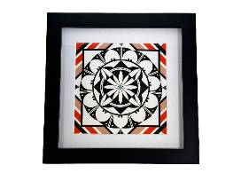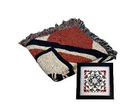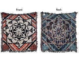 8th Generation "Balance" throw blanket, designed by Michelle Lowden (Acoma Pueblo). Measures 58" x 52" with matching tile design on both sides. Colors include black, dark orange, light orange, light tan, and turquoise. Inspired by patterns found in nature, this blanket is designed to evoke balance and reflect harmony.
