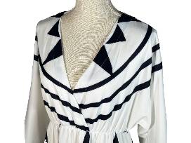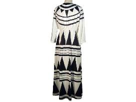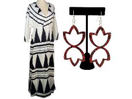 Indigenous artistry and elegance come alive in contemporary style with this striking black and white maxi dress by Choctaw Nation artist Kristin Gentry of Kreative Native. The dress features a bold dart motif inspired by traditional tattoo patterns, blending cultural symbolism with modern elegance. Designed for making a statement, it honors identity and artistry with every detail. Accentuating the look are Kristin Gentry's red double tulip acrylic earrings, adding vibrant color and bold flair to complete this distinctive ensemble.