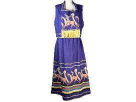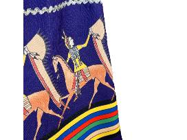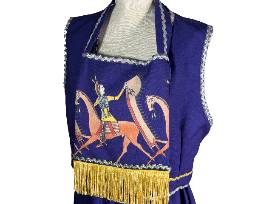 Striking 3-piece Purple Ledger Outfit by Navajo designer Kathleen Tom-Garcia. This handsewn ensemble includes a vest, skirt, and matching purse adorned with vibrant purple ledger designs and shimmering gold fringe. Horses, a powerful and culturally significant motif, take center stage in this unique creation, reflecting movement, strength, and spirit. This size small outfit blends tradition with bold design, offering a wearable tribute to Native storytelling and identity.