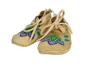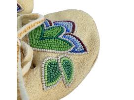 These handcrafted beaded baby moccasins by Wendy Boivin of Wendy's Bearzwear Designs (Menominee Tribe of Wisconsin) are made from soft tanned buckskin and feature a beautiful tulip design in green and blue beads. Rooted in Anishinaabe tradition, each pair includes a small hole-symbolizing that the baby has not yet walked and is not ready to return to the spirit world. A meaningful blend of cultural heritage and exquisite craftsmanship.