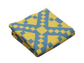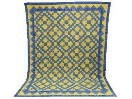 This stunning yellow and blue quilt was handmade by Navajo and Oklahoma Seminole designer Margaret A. Wood. Featuring a cotton top and polyester batting, the quilt's central block called Ft. Sumter commemorates the start of the Civil War. Margaret discovered the original centerpiece at an estate sale and added a blue and yellow stairstep border to expand its size. Upon initial research, she thought the pattern was related to Ft. Sumner, the Bosque Redondo site where Navajo and Mescalero Apaches were held in the 1860s. She infused the border with Navajo design elements inspired by traditional wedding baskets and rugs. Measures 104 inches high by 82 inches wide.
