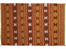 Celebrate the artistry of Navajo weaving with this stunning multicolor rug, created by an unknown Dine (Navajo) maker. Rich stripes of peachy orange, warm brown, golden yellow, rust red, soft grey, and crisp white form a vibrant tapestry that radiates balance and harmony. Alternating rows of hourglass motifs in white and red add rhythm and movement, symbolizing strength and continuity. Both a work of art and a cultural treasure, this piece reflects generations of weaving tradition. Perfect for display or collection, it's a striking reminder of resilience, beauty, and living heritage.