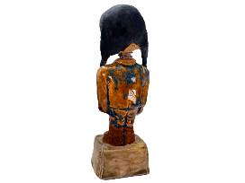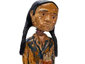 Bring home a rare work by Mechoopda artist Jacob Meders, whose art challenges history while sparking conversation. This hand-cast porcelain bobblehead reimagines the classic "Cigar Indian" figure, blending wit with cultural critique. With its expressive face, braided hair, and hand-painted details, this one-of-a-kind piece transforms a stereotyped image into a thoughtful and collectible work of contemporary Native art. Both playful and profound, it's sure to capture attention as a distinctive treasure for your collection.