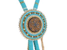 The Herschel Beaded Lariat by Maricela Hinojosa, artist and owner of Beaded Plume, blends tradition and modernity with deep cultural roots. Maricela, of Yaqui and Akimel O'odham descent from the Salt River Pima Maricopa Indian Community, crafts each piece with love, bridging past and present. This lariat features gold-plated, Miyuki, and Charlotte Cut beads, freshwater and coin pearls, horsehair, wood, and hawk bells. A laser-etched wooden medallion echoes O'odham basketry designs, accented with pearls. The horsehair fringe with bells adds movement and sound, showcasing heritage and artistry. Not water-safe to protect delicate beadwork and freshwater pearls.