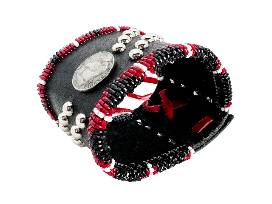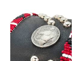 This striking leather cuff is a one-of-a-kind creation by Navajo/Omaha/Cherokee artist Jolene Dezbah Manus. Beautifully edged with her signature even beadwork in rich red, black, and white tones, it's accented with silver domed conchos and a rare Indian Head nickel for a bold, historical statement. Measuring 8.5" by 2.25", this cuff is a perfect blend of tradition and artistry. Jolene, the eldest granddaughter of Phoenix Indian Center founder Leon M. Grant, carries forward her family's legacy of leather craftsmanship with this exceptional design.