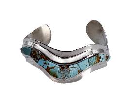 Delicate sterling silver inlay bracelet featuring natural Royston turquoise, crafted by renowned artist Ophelia Garcia. This petite ladies' piece measures 5.25 inches in length with a 1 1/8 inch opening, making it a perfect fit for smaller wrists. The vibrant blue-green hues of the Royston turquoise beautifully contrast with the polished silver, showcasing exquisite craftsmanship and timeless Southwestern style. Ideal for everyday wear or special occasions, this elegant wavy bracelet combines natural beauty with artisanal skill.