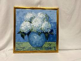 Donated in memory of Vivian Rose Weaver. This exquisite painting by artist Beatrice Plath features five vibrant hydrangeas, lovingly created in memory of her cherished granddaughter, Vivian Rose Weaver, who bravely battled DIPG. The piece is a 16x 16 acrylic on canvas, elegantly presented in a one-inch gold-leafed wood floater frame that enhances its warmth and beauty. The hydrangeas, symbols of heartfelt emotion and resilience, serve as a moving tribute, making this artwork not only a stunning visual piece but also a powerful story of love and remembrance. A meaningful addition to any collection, this item carries both artistic and emotional significance.