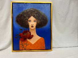 Donated in memory of Vivian Rose Weaver. In memory of her granddaughter Vivian, artist Beatrice Plath created this powerful 16x 20 oil on canvas. A woman, boldly painted in vivid strokes of ChadTough orange and blue, stands at the heart of the piece, symbolizing strength, spirit, and hope. The artwork is finished in a 1" gold leaf floater frame that enhances its emotional depth and vibrant energy. This moving tribute captures the essence of love, remembrance, and resilience, honoring Vivian's legacy through art.