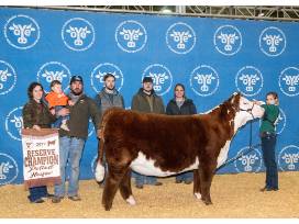 The dark red heifer is the first heifer calf out of a female that was successfully campainged by the Norvell family in 2022-2023. Her grandmother Star SSF KKH Mirror Image 287W needs no introduction, was one of the most striking Hereford females of her time. 411 offers a striking look while not sacrificing the added bone and power needed to compete.