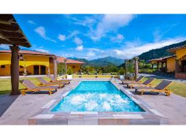 Los Establos Boutique Inn, winner of TripAdvisor's Travelers Choice Award, is a distinctive collection of comfortable suites and accommodations nestled 4,000 feet above sea level. Spread across 16 acres in the midst of a lush coffee plantation, this charming estate offers panoramic views of the BarĂº Volcano set against Boquete's green mountains, blue waterfalls and rushing rivers. All deluxe accommodations feature marble bathrooms, regional artwork, and private patios, allowing for full enjoyment of the fresh mountain air. Amenities such as flat-screen TV's with satellite, plush bathrobes, and Wi-Fi ensure modern comforts coincide with Mother Nature's magnificence. Stroll along secret paths as you breathe in the aroma of coffee and the perfumes of the region's lush tropical gardens.