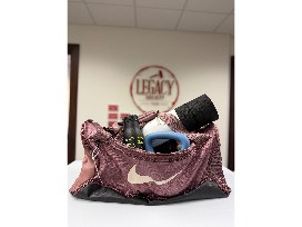 - A fitness gear bundle featuring a Nike gym bag, yoga-fitness mat, cooling towel, Reebok medium resistance tube, water bottle, Muscle Milk vanilla protein powder, and 8-pound kettlebell