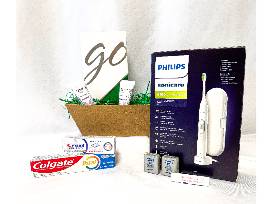 Gift Basket including Electric toothbrush & whitening kit.