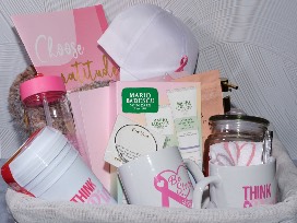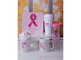 Show your support with Breast Cancer-themed items including pens, pins, a towel, gratitude journal, inspirational sign, coffee cups, soft socks, travel mugs, hat, and water bottle.