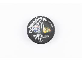 This official warm-up puck is from the January 21, 2020 game against the Florida Panthers and is signed by former Blackhawks captain Jonathan Toews and Florida Panthers captain Aleksander Barkov.