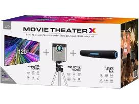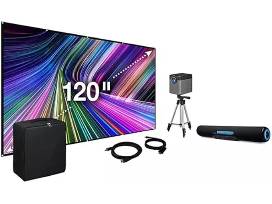 Includes a 130" foldable diagonal screen, projector with built-in Bluetooth transmitter and full-range speakers, and a portable Bluetooth speaker