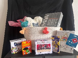 Gather for a night of fun with this 5th-grade class-created basket! It features a customized class puzzle, exciting games like Blank Slate, Just One, Spot It, Qwixx, and The Uzzle, a cozy cream-colored faux fur throw, and a $25 Domino's gift card-all packed into one playful and cozy set. Perfect for family game nights!