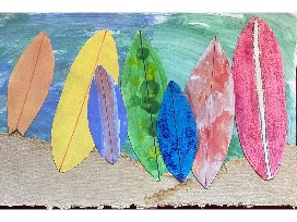 This original, one-of-a-kind artwork is a complex layered piece. The background is a green/blue tempera paint wash. The surfboards are colored paper, painted and textured with crayons, then glued to the background.