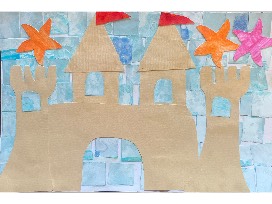 This one-of-a-kind artwork is layered. The background was created with dozens of blue-washed painted squares laid as an ocean/sky background mosaic. The castle is made of heavy brown paper, while the starfish and flags are painted and glued.