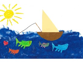 This original, one-of-a-kind artwork is a layered piece. The ocean is deep blue tempera paint on a thick textured white paper. The sailboat is constructed of two colors of construction paper. And the fish are individually hand-drawn, cut out, painted, and then glued to the paper.