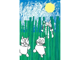 This original, one-of-a-kind artwork is a complex, layered piece. The background is blue tempera paint wash, with a white paint layer. Each kitten is hand-drawn and cut out. The bright green grass is individual strips of two green papers. The sun, grass and kittens are glued to the background.