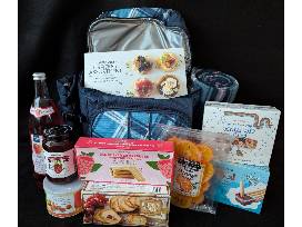 Includes crackers, preserves, cookies, dried oranges, trail mix bars, sparkling berry lemonade, and more!