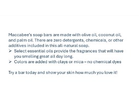 Maccabee's Handmade Soaps are made with olive oil, coconut oil, ad palm oil. There are zero detergents, chemicals, or other additives included in this all-natural soap.