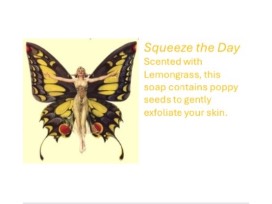 - Lemongrass Poppyseed-Sqeeze the Day is scented with lemongrass. This soap contains poppy seeds to gently exfoliate your skin.
