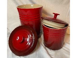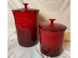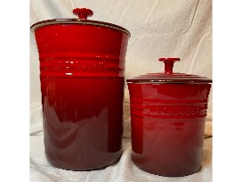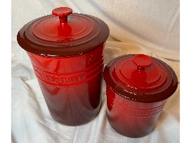 Add a pop of elegance to your kitchen with this set of two Le Creuset Cerise (cherry red) Canisters in excellent condition!