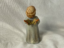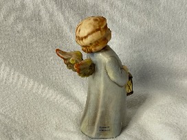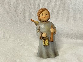 This 4-inch angel, complete with lantern and horn, bears the TMK-6 mark and a black ink M.I. Hummel signature.