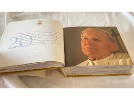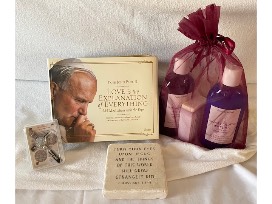 The book by Pope John Paul II is in excellent condition and has been gently loved. The Immaculate Waters gift set is new in its original packaging. The St. Benedict Crucifix appears new in its original box. The decorative stone is gently loved, without original packaging.