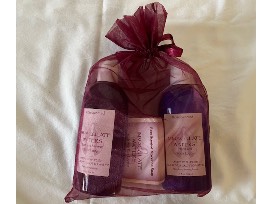 - A gift set of "Immaculate Waters" bath and body products featuring rose-scented liquid soap and hand and body lotion, along with a bar of soap. These products are made with Lourdes Grotto water.