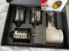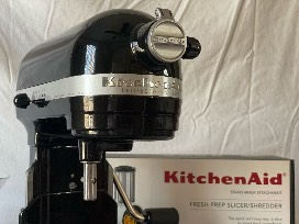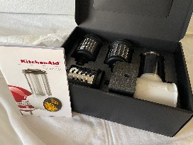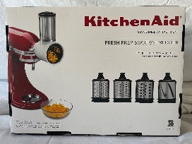 Enhancing this set is a brand-new KitchenAid Fresh Prep Slicer/Shredder attachments Set, in its original box, featuring four blades (Slicing blade, Coarse shredding blade, Medium shredding blade, and Fine shredding blade) and a 2-in-1 food pusher--perfect for shredding cheese, slicing veggies, and more.