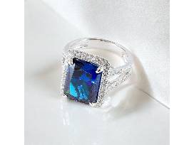Surrounding the sapphire is a halo of sparkling cubic zirconia stones, carefully selected for their brilliant shine and clarity, which add a touch of glamour and elevate the center stone's radiance. The cubic zirconia stones are meticulously set to create a continuous burst of brilliance, offering a refined and elegant contrast to the deep blue of the sapphire.