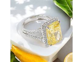 At its center, the ring showcases a captivating simulated citrine gemstone, cut in a distinctive ice-cut shape that maximizes its brilliance and depth. The stone's vibrant golden hue is reminiscent of warm sunlight, exuding a sense of radiance and sophistication. Each facet of the ice-cut design reflects light with unparalleled sparkle, creating a dazzling focal point that is both modern and timeless.
