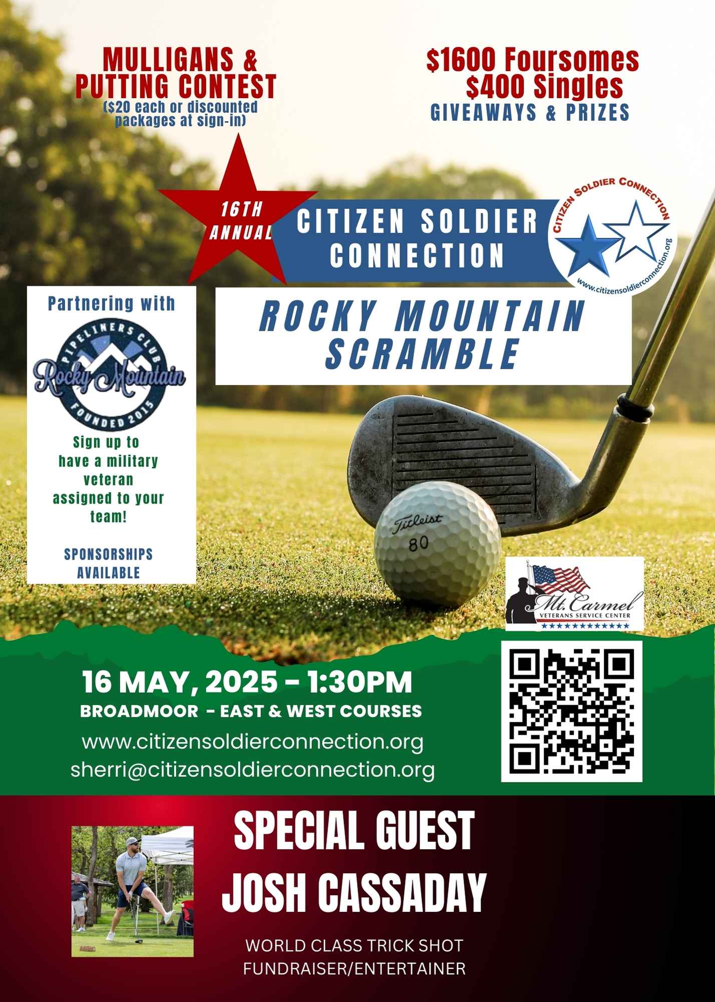Welcome to the 16th Annual Citizen Soldier Connection Rocky Mountain Scramble. Last year was a huge success, raising over $80K, so this year we're partnering with the Rocky Mountain Pipeliners Club again to double our efforts and reach a goal of $125K. To accomplish that, we've rented BOTH of Broadmoor's courses - that's 36 holes and over 250 golfers!!