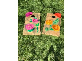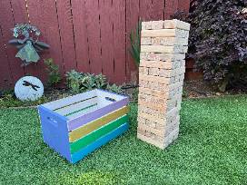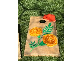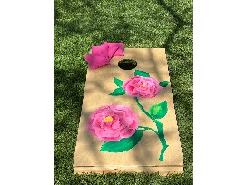 This one-of-a-kind set includes a hand-painted cornhole game set, adorned with vibrant marigolds and camellias, thoughtfully painted by the Marigold students, along with a handmade giant Jenga set and bubbles for some classic, lighthearted fun.