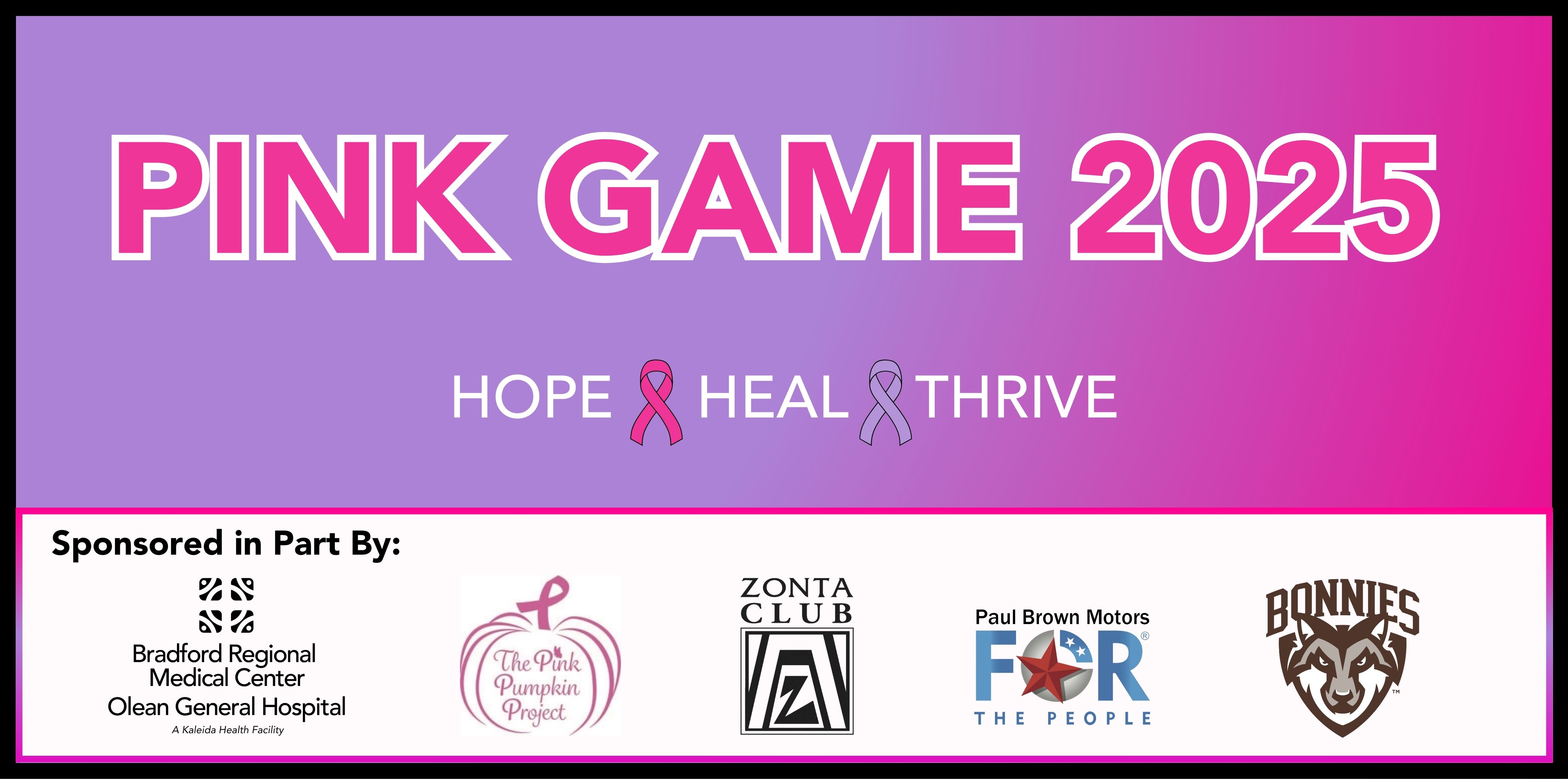 T-shirts will be available for PICK UP ONLY at the Pink Game on Saturday February 8th. Raffle ticket and 50/50 sales will be available until 1:00pm on February 8th. Winners will be drawn and announced during halftime.