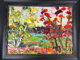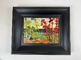 This textured oil painting beautifully captures the energy and spirit of a natural landscape. Framed in elegant black, this piece adds a lively, contemporary touch to any space.