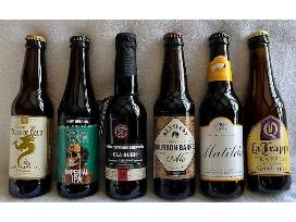 A selection for the discerning beer enthusiast. Included in this handsome solid wood holder, with attached opener, are the following six distinctive brews:
